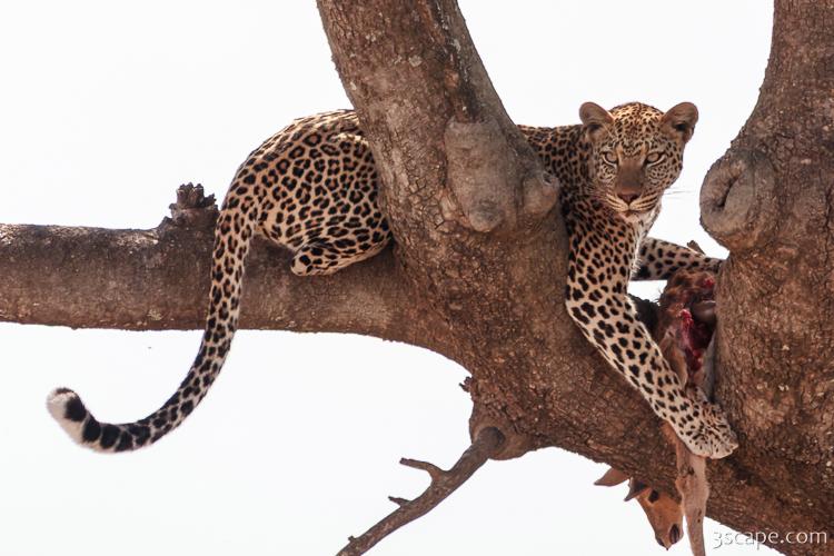 Picture of Leopard with a fresh gazelle kill in a tree in gallery Serengeti National Park.