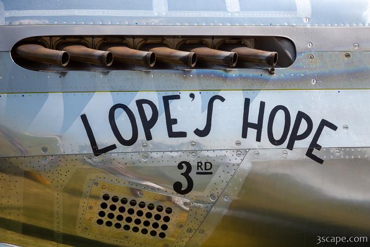 P-51C Mustang Lope's Hope the 3rd was assigned to Lieutenant Donald Lopez, who had 5 confirmed victories during World War II, in the China-Burma-India theater. Lope's Hope is currently housed at the Dakota Territory Museum in Minot, North Dakota.