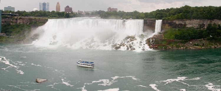 Panoramic of tour boat floating past the American Falls in Niagara Falls, Canada.