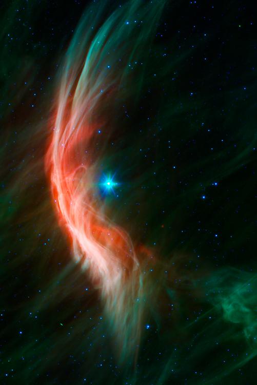 The giant star Zeta Ophiuchi is having a "shocking" effect on the surrounding dust clouds in this infrared image from NASA's Spitzer Space Telescope. Stellar winds flowing out from this fast-moving star are making ripples in the dust as it approaches, creating a bow shock seen as glowing gossamer threads, which, for this star, are only seen in infrared light.