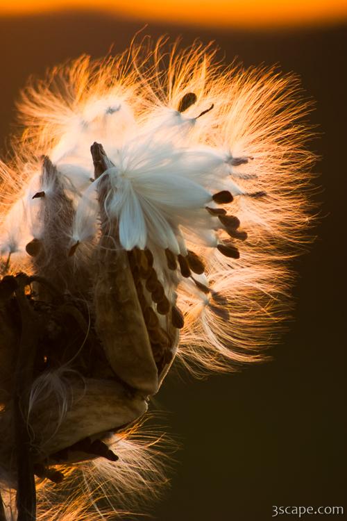 Milkweed Seed Pod busting open in the autumn sunset, Galena, Illinois.