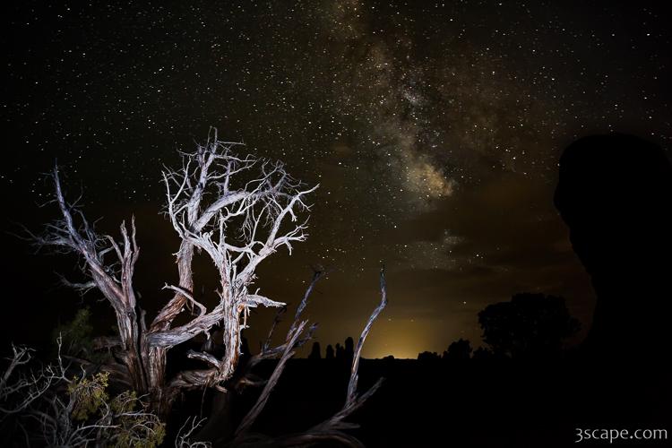 Painting with light in the beautiful sandstone red rocks of Arches National Park near Moab, Utah. The glow of Moab's lights create a silhouette of Balanced Rock and other area features, while clouds partially obscure the Milky Way.