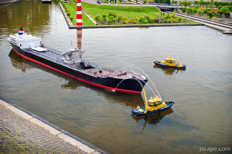 Picture of Model oil barge on fire in gallery Den Haag (The Hague).