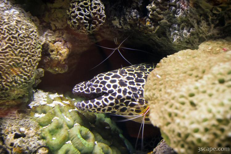 Picture of Moray Eel with cleaner shrimp in gallery John G. Shedd Aquarium.
