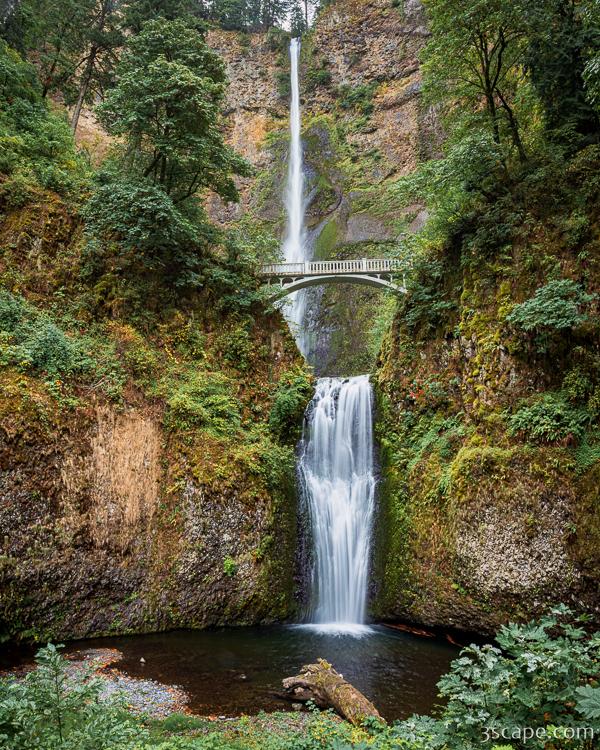 Color version of the whole waterfall and Benson Bridge. Multnomah Falls is a waterfall located on Multnomah Creek in the Columbia River Gorge, east of Troutdale, between Corbett and Dodson, Oregon, United States. The waterfall is accessible from the Historic Columbia River Highway and Interstate 84. Spanning two tiers on basalt cliffs, it is the tallest waterfall in the state of Oregon at 620 ft in height. Multnomah Falls is the tallest waterfall in Oregon and the second tallest in the United States.