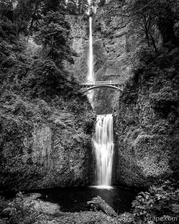 Black and white version of the whole waterfall and Benson Bridge. Multnomah Falls is a waterfall located on Multnomah Creek in the Columbia River Gorge, east of Troutdale, between Corbett and Dodson, Oregon, United States. The waterfall is accessible from the Historic Columbia River Highway and Interstate 84. Spanning two tiers on basalt cliffs, it is the tallest waterfall in the state of Oregon at 620 ft in height. Multnomah Falls is the tallest waterfall in Oregon and the second tallest in the United States.