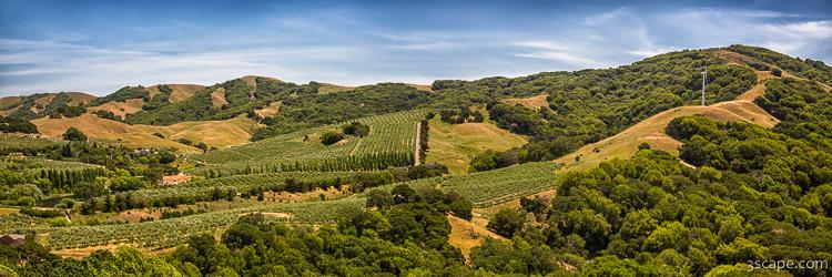 A beautiful panoramic of Central California's wine country - vineyards around Napa Valley.