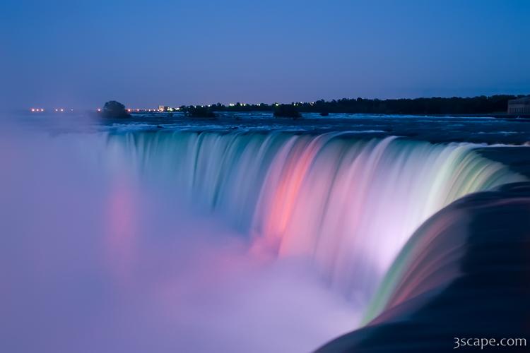 Illuminated Niagara Falls at dusk, Ontario, Canada.
