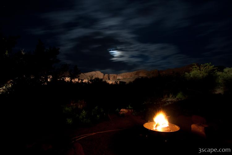 Night shot of camp site with illuminated canyon walls Fine Art Print