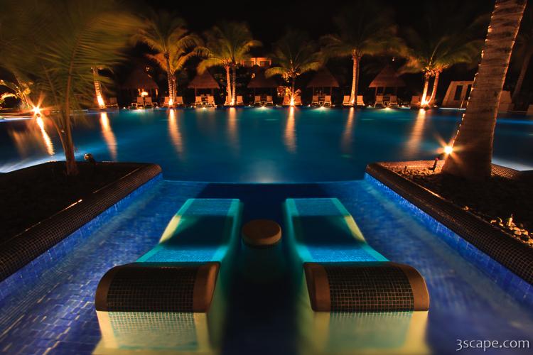 Picture of Night shot of the adult pool with sunken loungers in gallery Barcelo Maya Palace Resort.