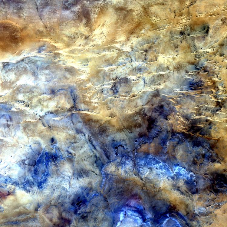 A study in shades of blue and brown is actually one of the harshest landscapes on Earth. This glimpse of Africa's Sahara Desert, located near where the borders of Mali, Niger, and Algeria converge, is truly a no man's land, a world of sand and rock without roads or settlements. The horizontal lines across the top half of the image are intrusions of igneous rock, where magma poked up to the surface from deep underground.
