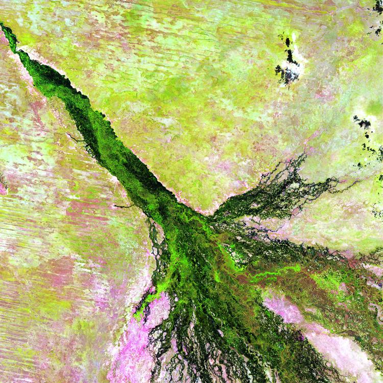 Like a watercolor in which a brushstroke of dark green has bled into a damp spot on the paper, southern Africa's Okavango River spreads across the pale, parched landscape of northern Botswana to become the lush Okavango Delta. The delta forms where the river empties into a basin in the Kalahari Desert, creating a maze of lagoons, channels, and islands where vegetation flourishes, even in the dry season, and wildlife abounds.