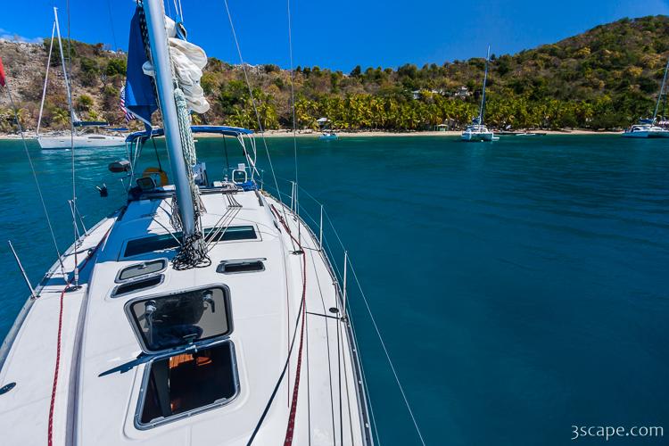 Standing on the bow of our just anchored sailboat, ready to jump into the warm, crystal clear Caribbean waters.