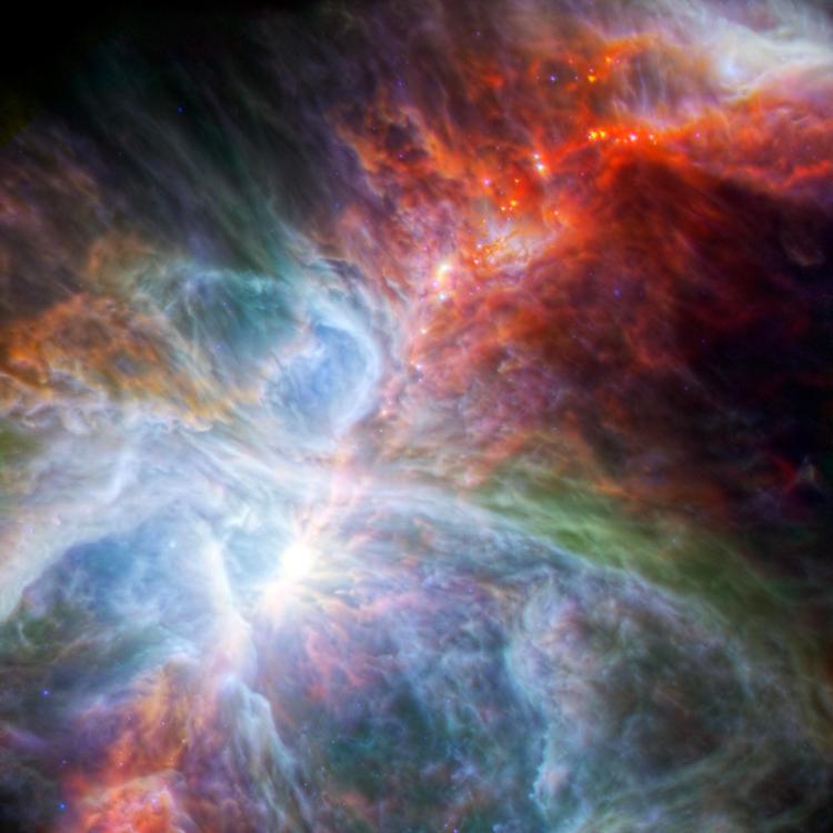 This new view of the Orion nebula highlights fledgling stars hidden in the gas and clouds. It shows infrared observations taken by NASA's Spitzer Space Telescope and the European Space Agency's Herschel mission, in which NASA plays an important role.