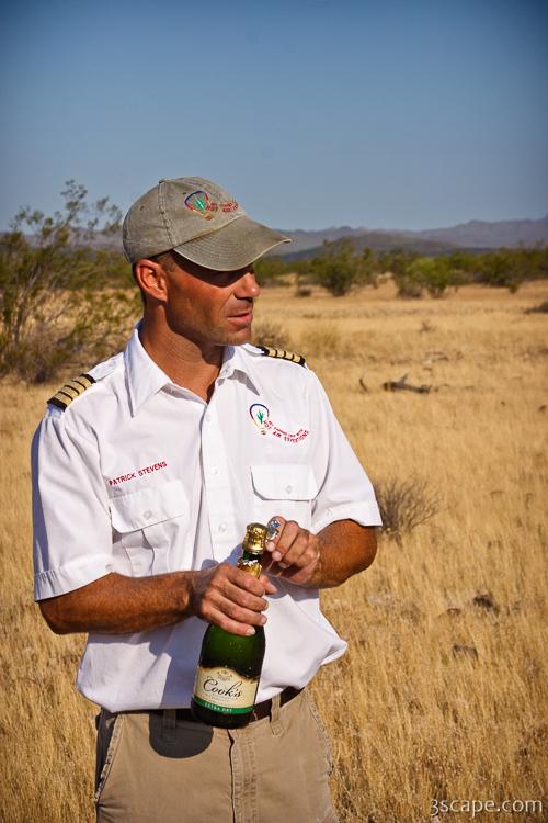 Picture of Our balloon pilot opening the champagne in gallery Phoenix (9-2005).