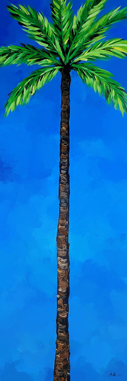 Painting of tall coconut palm tree on sky blue background. This is #5 in a series of 6 rainbow colored individual palm trees. Also available, the combined polyptych.