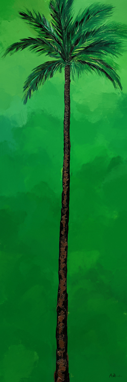 Painting of tall coconut palm tree on lush green background. This is #4 in a series of 6 rainbow colored individual palm trees. Also available, the combined polyptych.