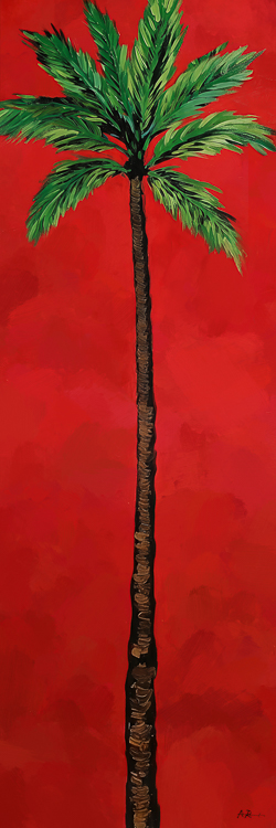 Painting of tall coconut palm tree on crimson red background. This is #1 in a series of 6 rainbow colored individual palm trees. Also available, the combined polyptych.