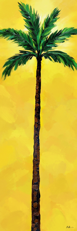 Painting of tall coconut palm tree on golden yellow background. This is #3 in a series of 6 rainbow colored individual palm trees. Also available, the combined polyptych.