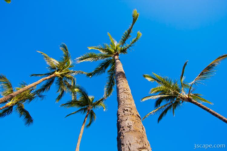 Tall palm trees against bright blue sky on Maui, Hawaii.