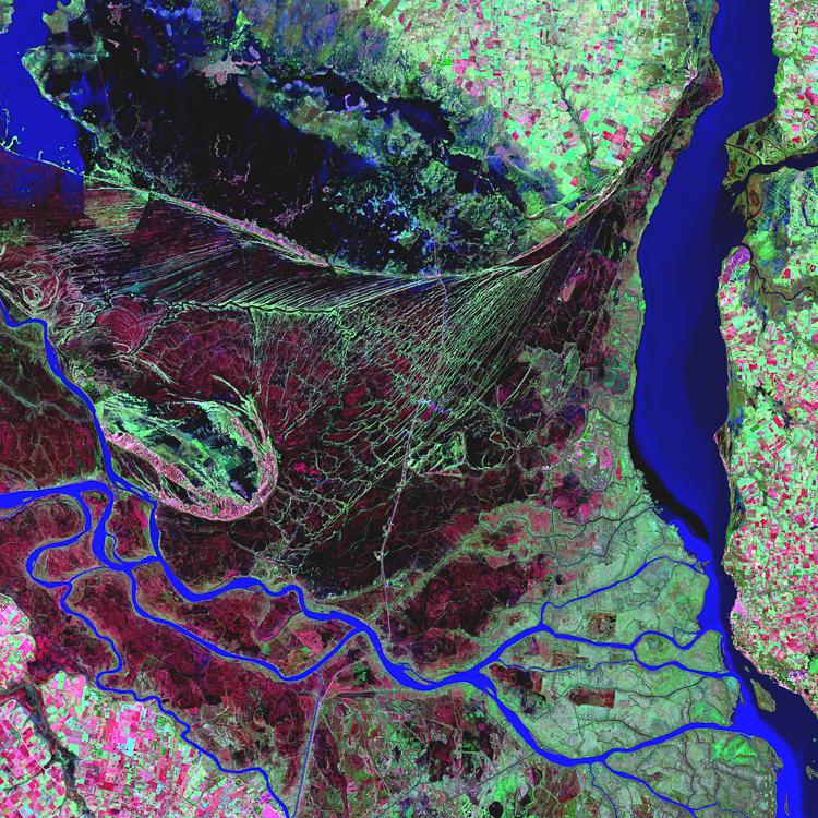 The Parana River delta is a huge forested marshland about 32km northeast of Buenos Aires, Argentina. The area is a very popular tour destination. Guided boat tours can be taken into this vast labyrinth of marsh and trees. The Parana River delta is one of the world's greatest bird-watching destinations. This image highlights the striking contrast between dense forest and wetland marshes, and the deep blue ribbon of the Parana River.