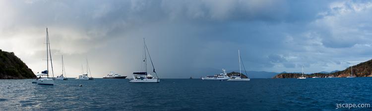 An afternoon rain shower passes through the Sir Francis Drake Channel in the British Virgin Islands. These boats are tied off to moorings for the night, in the safety of Norman Island's Bight Bay.