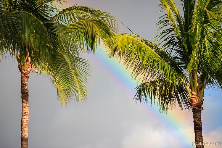 A bright, colorful rainbow appears between some palm trees during a brief rain shower in Maui, Hawaii.