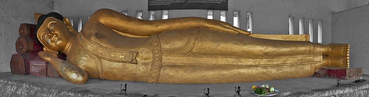 Stitched panoramic image of reclining Buddha statue in Chiang Mai, Thailand.