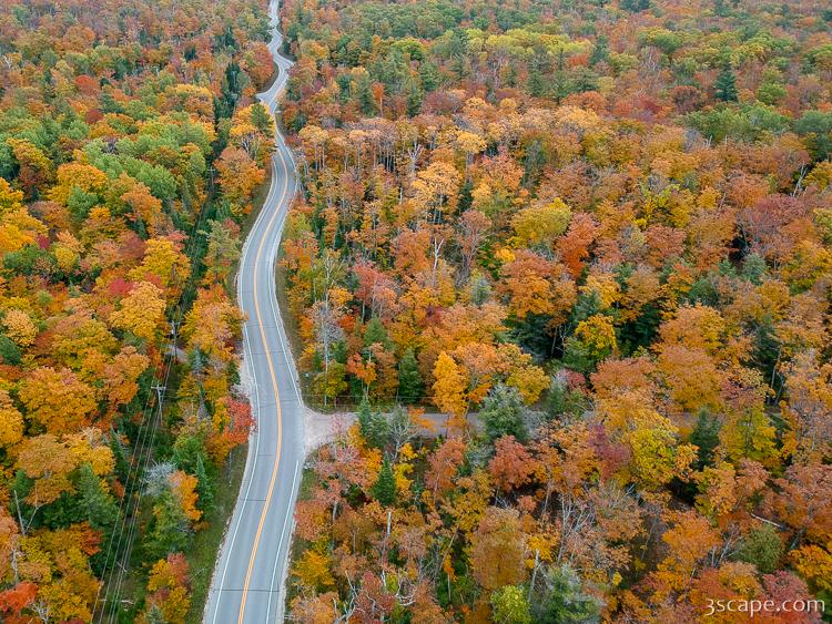 This is an aerial image of Route 42 in Door County, Wisconsin. This is also known as Jens Jensen's Winding Road, Highway 42 near Northport. Door County is a popular vacation and tourist destination, especially for residents of Wisconsin and Illinois, especially during autumn, when there are numerous fall festivals in the quaint small towns (Fish Creek, Egg Harbor, Sister Bay, Ephraim, Ellison Bay).