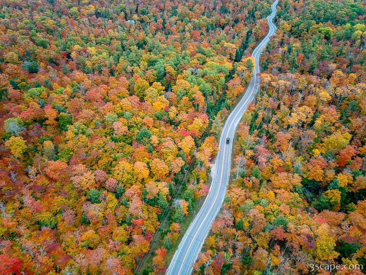 This is an aerial image of Route 42 in Door County, Wisconsin. This is also known as Jens Jensen's Winding Road, Highway 42 near Northport. Door County is a popular vacation and tourist destination, especially for residents of Wisconsin and Illinois, especially during autumn, when there are numerous fall festivals in the quaint small towns (Fish Creek, Egg Harbor, Sister Bay, Ephraim, Ellison Bay).