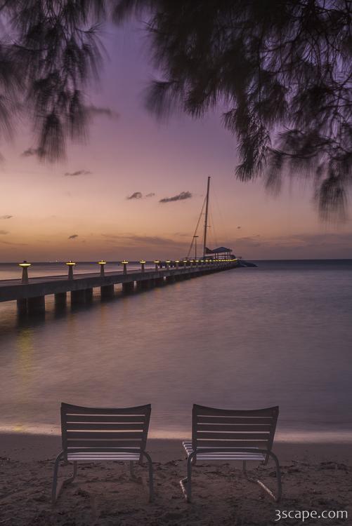 The sun sets on beautiful Grand Cayman island in the Caribbean Sea. This gorgeous view point is from the North Side, at Rum Point Beach. The famous pier stretches to meet a catamaran floating in the North Sound, not far from Stingray City and sand bar. No more perfect place to sit and relax than a couple of beach chairs in the sand, under swaying Australian Pine trees, listening to the calm waters lapping the shore.