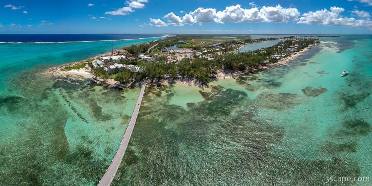 Large panoramic of Rum Point beach, The Wreck Bar & Grill, Rum Point Club Restaurant, and pier. Looks like new condos are being built as well.