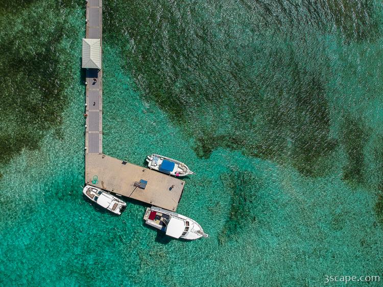 Top down view of the pier at Rum Point, where boats come and go from Stingray City (sandbar).