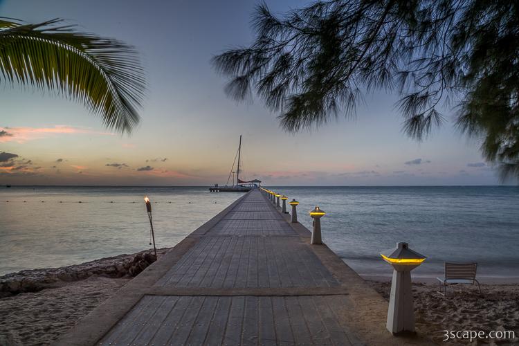 The sun sets on beautiful Grand Cayman island in the Caribbean Sea. This gorgeous view point is from the North Side, at Rum Point Beach. The famous pier stretches to meet a catamaran floating in the North Sound, not far from Stingray City and sand bar. No more perfect place to sit and relax than a couple of beach chairs in the sand, under swaying Australian Pine trees, listening to the calm waters lapping the shore.