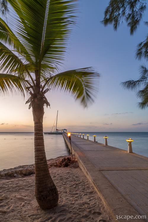 The sun sets on beautiful Grand Cayman island in the Caribbean Sea. This gorgeous view point is from the North Side, at Rum Point Beach. The famous pier stretches to meet a catamaran floating in the North Sound, not far from Stingray City and sand bar. No more perfect place to sit and relax than a couple of beach chairs in the sand, under swaying Australian Pine trees, listening to the calm waters lapping the shore.