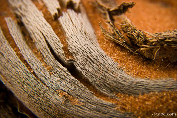 Macro (close-up) photograph of an old bit of driftwood in sand, Coral Pink Sand Dunes, Arizona.