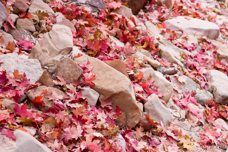 Picture of Sandy wash and red leaves in gallery Zion Colors.