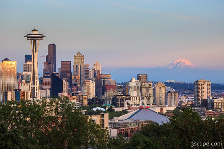 Seattle skyline at sunset, with Mount Rainier floating on a layer of cloud in the distance. Many of Seattles great locations are visible in this image, including the Seattle Great Wheel, Seattle Center, sports stadiums, and Seattle's harbor and shipping docs.
