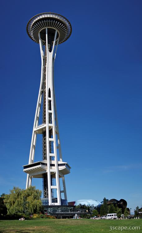 Vertical panoramic of the Seattle Space Needle and Science Fiction Museum in Washington State.