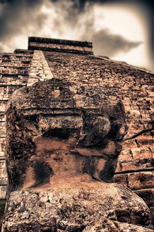 Picture of Serpent head at the base of El Castillo in gallery Chichen Itza and Coba - Mayan Ruins.