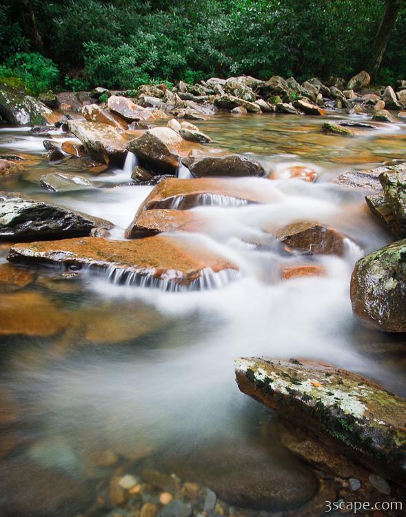 One of hundreds of picturesque mountain streams in the Great Smokey Mountains. I love the beautiful colors of the rocks, and the water cascading everywhere. A serene place to be.