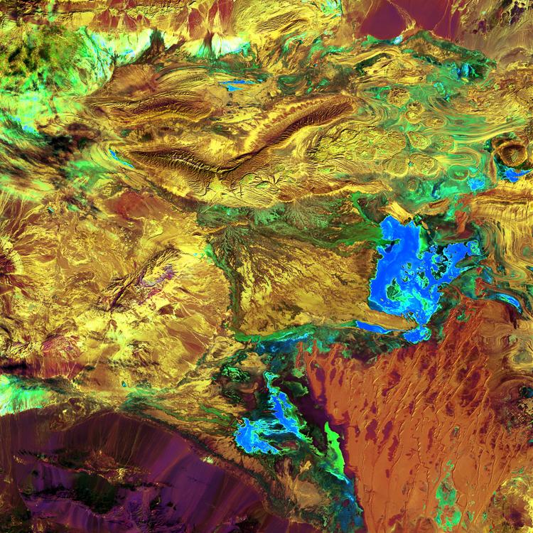 Like poster paints run wild, this image reveals an eclectic montage of landscapes in Iran's largest desert, the Dasht-e Kavir, or Great Salt Desert. The word kavir is Persian for salt marsh. The almost uninhabited region covers an area of more than 77,000 square kilometers (29,730 square miles) and is a mix of dry streambeds, desert plateaus, mudflats, and salt marshes. Extreme heat, dramatic daily temperature swings, and violent storms are the norm in this inhospitable place.