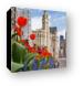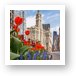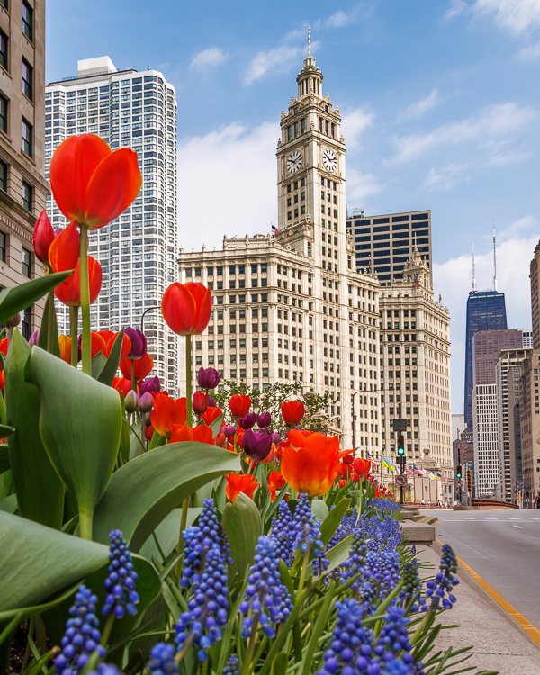 Spring in Chicago is amazing, with flower beds all over the city bursting with bright colors of all kinds. Here along Michigan Avenue, grape hyacinth and tulips fill the street with reds, blues, and purples. Iconic Wrigley Building towers in the background, with the John Hancock building making an appearance in the distance.