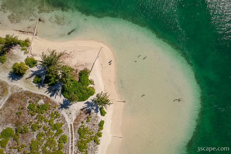 Aerial drone view of Starfish Point near Rum Point, Grand Cayman. There's a wide beach with shallow water where starfish gather (though not in the numbers they used to). Further out, the water gets deep and the bottom is covered in sea grass.