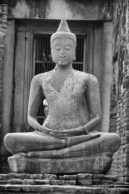 Ancient stone sitting Buddha at a ruined temple in Lop Buri, Thailand.