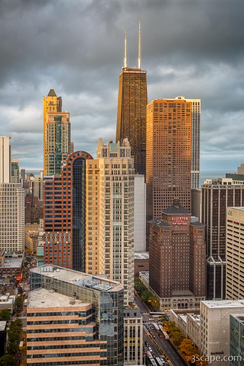 Amazing low level aerial view of Michigan Avenue, the Magnificent Mile, Streeterville, John Hancock Building, and the Allerton Hotel in downtown Chicago in the fall. This color version accentuates the tones and lines of the incredible architecture of Chicago's highrise office buildings and residences, shown in the warm glow of the evening sun on a cloudy day.