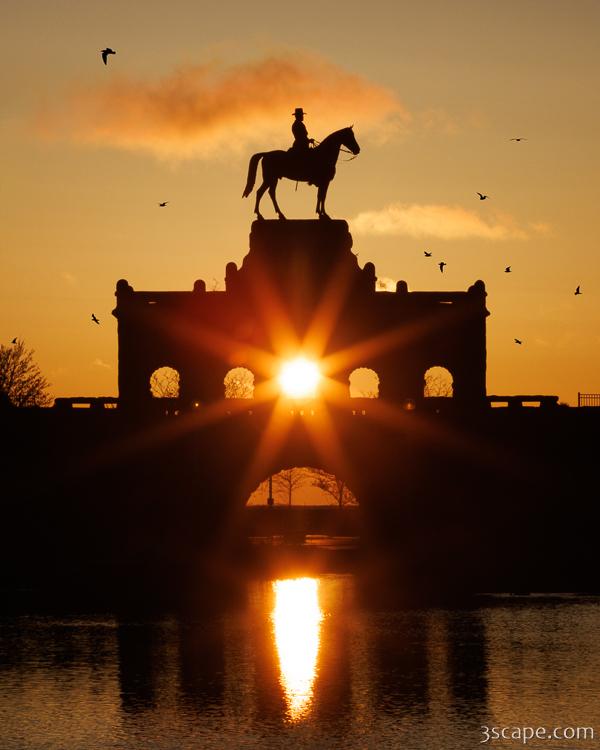 As the sun rises over Lake Michigan in the Spring and Fall in Chicago, the alignment is just right to get the sun to shine through the arches of the Ulysses S. Grant Monument in Lincoln Park.