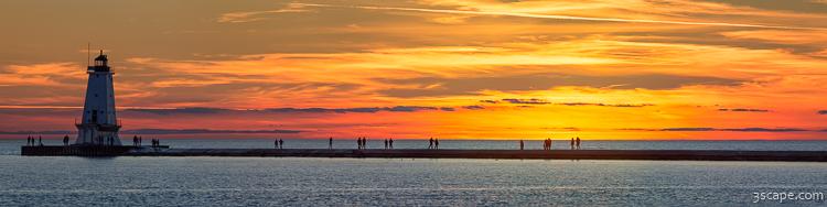 Ultra wide, high resolution (HD) panoramic image of a beautiful Lake Michigan sunset over Ludington North Breakwater Lighthouse. The Ludington Light is one of the most famous in Michigan, and voted the best.