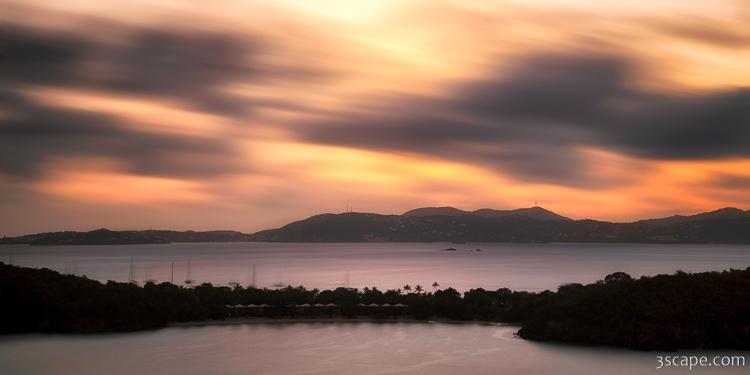 Photographed from Peace Hill, this is a long exposure image just after sunset, on an evening that the clouds were moving at a pretty brisk clip. In the foreground is Hawksnest Bay and Caneel Bay Resort. In the background lies St. Thomas.