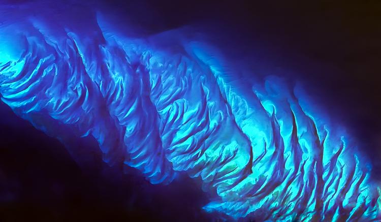 In this ASTER image the features that look like folded material are carbonate sand dunes in the shallow waters of Tarpum Bay, southwest of Eleuthera Island in the Bahamas. The sand making up the dunes comes from the erosion of limestone coral reefs, and has been shaped into dunes by ocean currents.